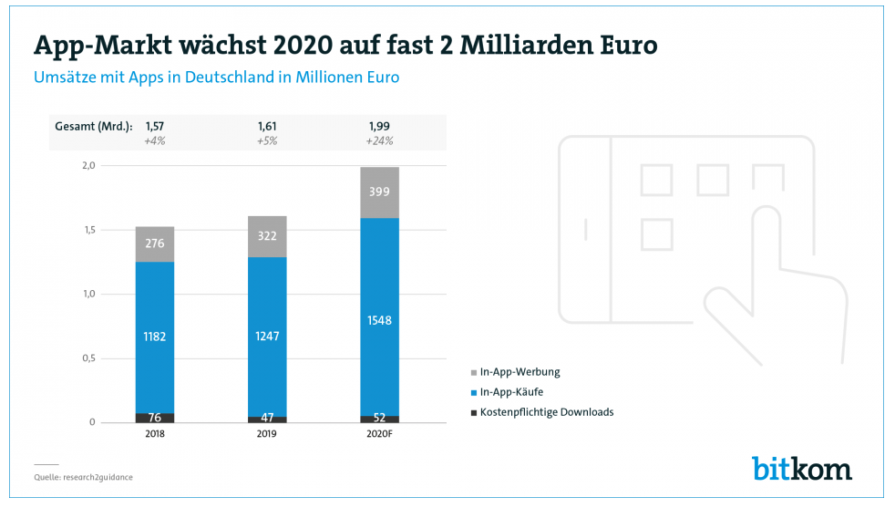 Der deutsche App-Markt stellt jedes Jahr neue Rekorde auf: Im Jahr 2020 werden voraussichtlich 1,99 Milliarden Euro mit Apps umgesetzt – ein Plus von 24 Prozent gegenüber dem bisherigen Rekordjahr 2019 (1,61 Milliarden Euro).